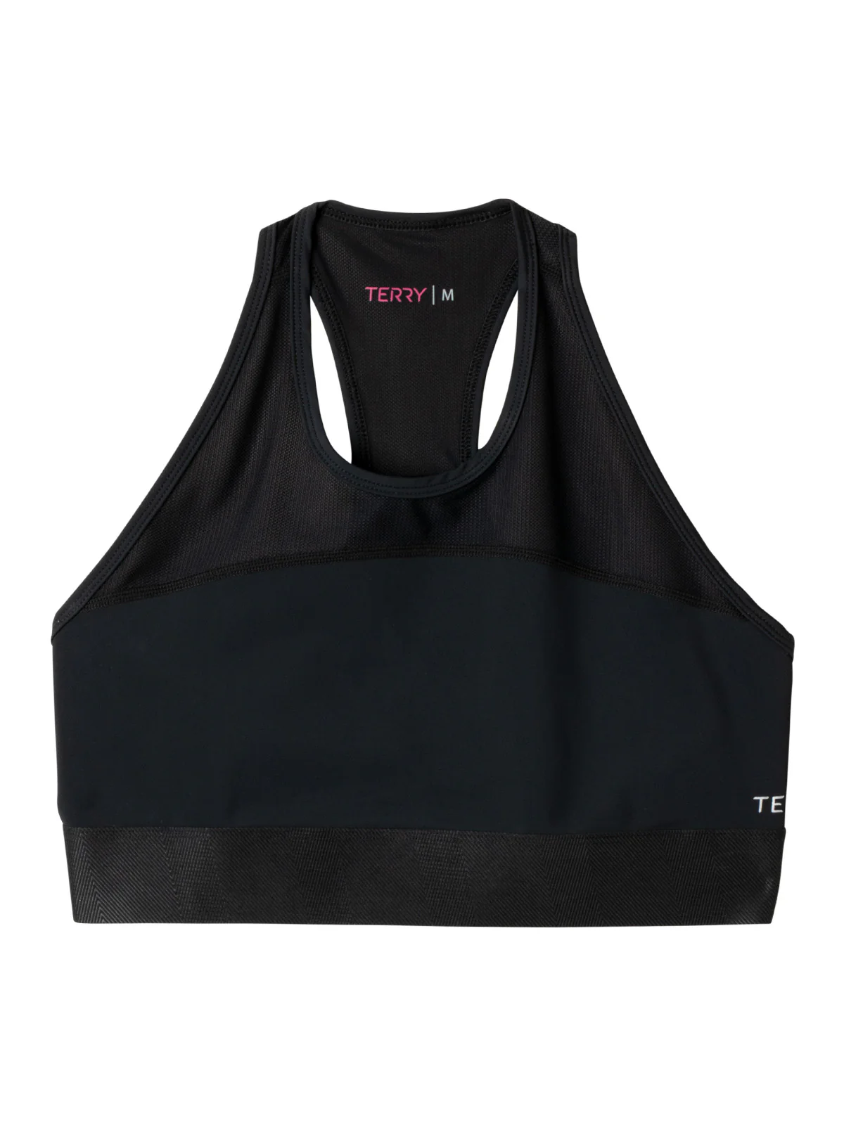 A lucky fabric find led to the re-introduction of Terry's Cyclo Bra. Made of a silky blend of nylon/spandex and mesh, it will keep you dry and ventilated in just the right areas. It curves comfortably around arms and shoulders and has a traditional racer back fit. A stout underbust elastic band provides support without being tight or restrictive.