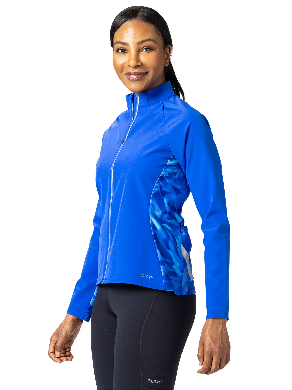 Redesigned to do it all in one garment: full wind protection in front; moisture transport and temperature regulation in rear; high visibility throughout. Newly printed this season in a bold chromatic sapphire, the Hybrid Jacket is a standout from every direction. The full-zip front has a full wind flap with zipper garage to keep you completely protected and we deliberately eliminated elastic at sleeve ends and hemline for less restriction. Stretch panels on backs of arms and in the rear aid in on-bike mobility; open rear pockets with reflective taping are functional and flashy. Semi-fitted.