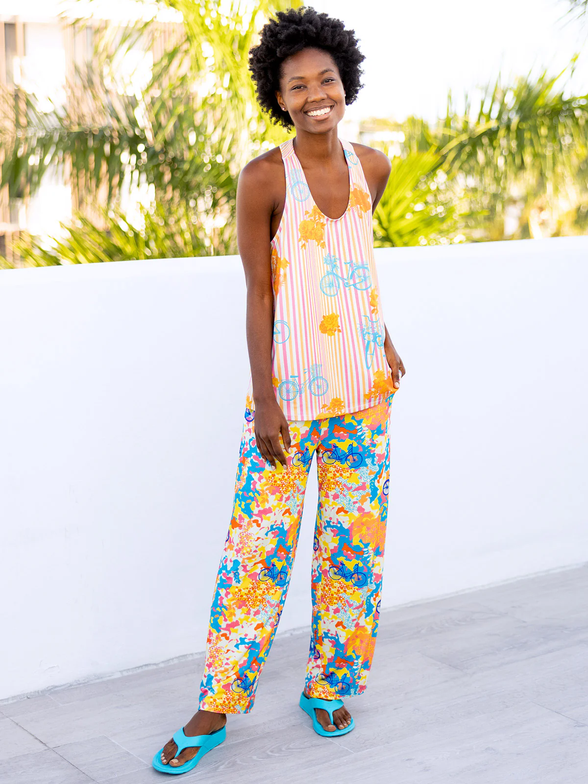 What’s not to love about the dreamy free-flowing, full-throttled T-back Tank by Benares. A showstopper of dramatic design with its deeply cut T-back and ultra-bright Parisian print -this tank also packs on loads of versatility for bike, life and lounge to warrant a bevy of adventure from sunup to sunset. Relaxed fit.